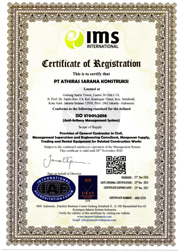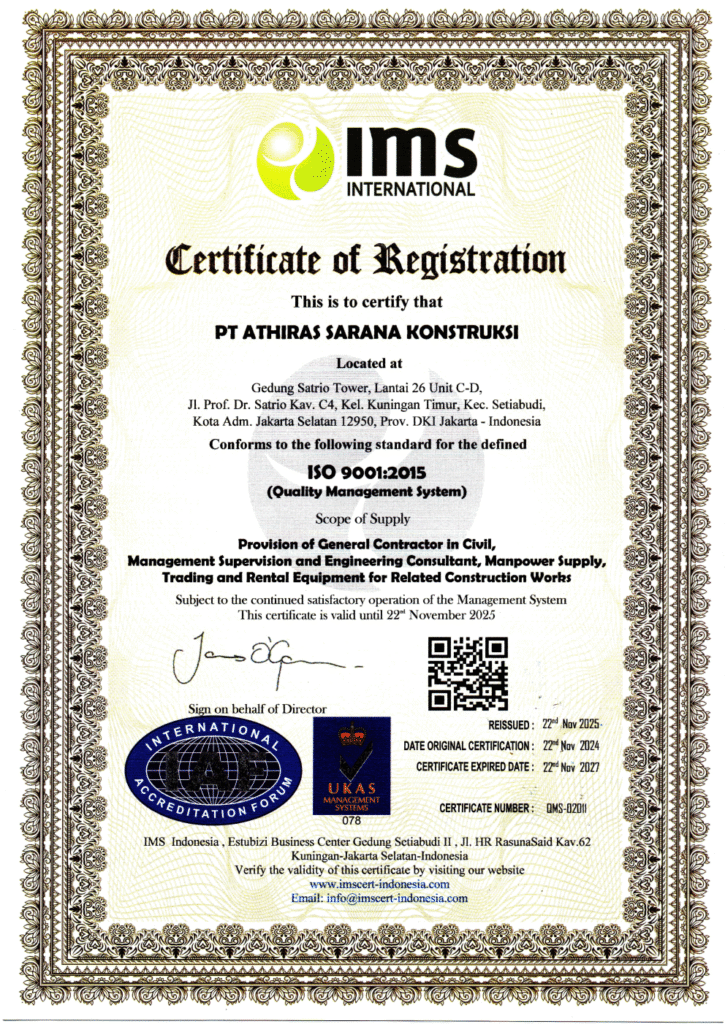 At PT. Athiras Sarana Konstruksi, our unwavering commitment to precision and integrity extends beyond every project we undertake to the very core of our operational processes. We are proud to hold internationally recognized ISO certifications, a testament to our dedication to maintaining the highest global standards in every facet of our engineering, construction, and general supply services.